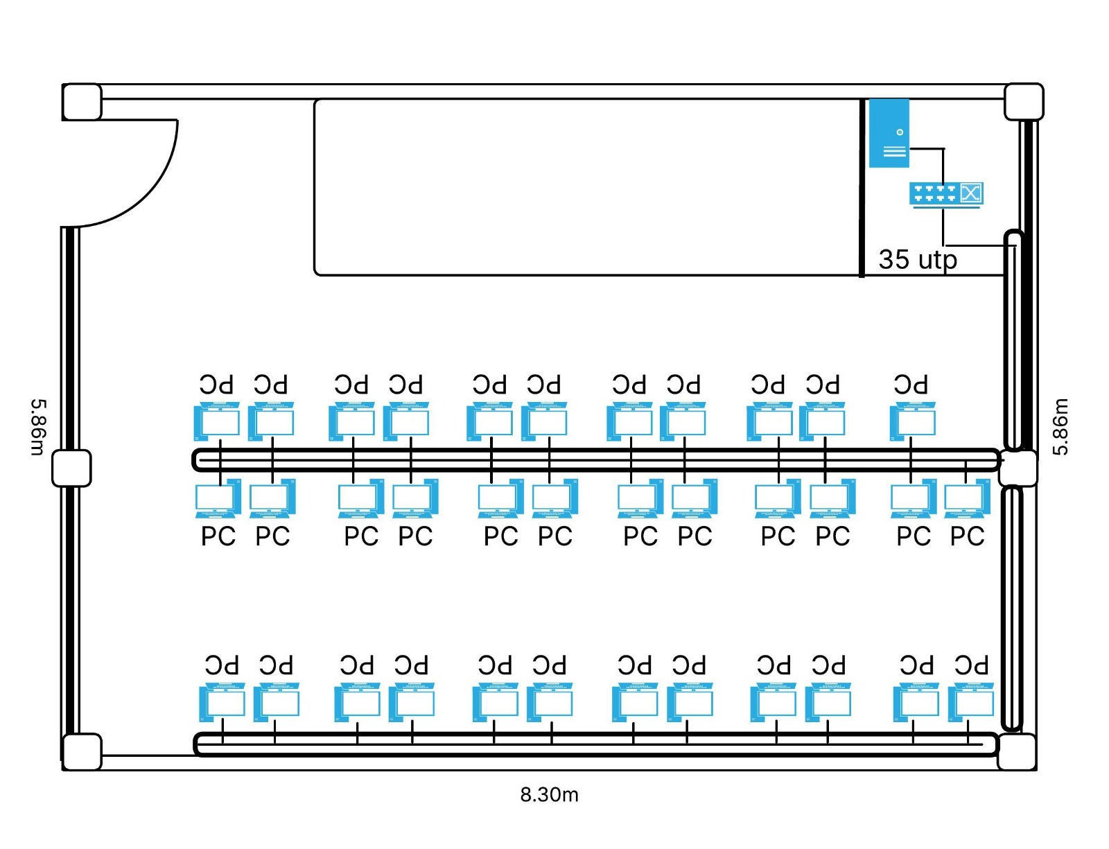 El mapa físico muestra la distribución real del centro de cómputo dentro del aula. Incluye la ubicación exacta de cada computadora, las canaletas, las mesas de trabajo, el rack de comunicaciones y el punto donde se concentran los 35 cables UTP. Este plano permite visualizar la distancia aproximada del cableado, la organización del mobiliario y el trayecto que siguen los cables desde cada equipo hasta el rack, asegurando una instalación ordenada y eficiente.