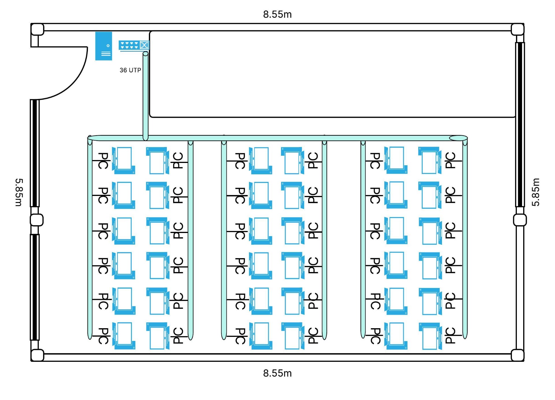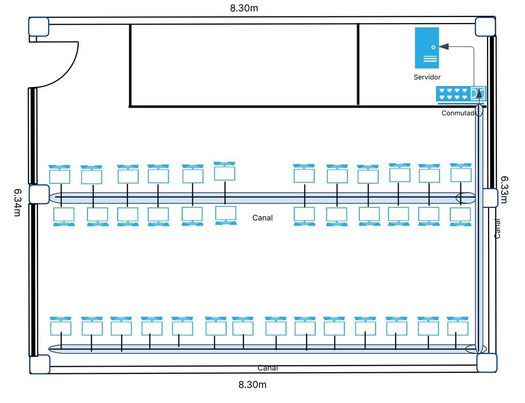 El mapa físico muestra la distribución real del aula, incluyendo la posición de las computadoras, las canaletas de cableado, las filas de mesas y el área donde se encuentra el servidor, el switch y el rack principal. También se indica la cantidad total de cables UTP —36 en este caso— y el recorrido que sigue el cableado desde cada equipo hasta el punto de concentración. Esta vista permite planificar el montaje, calcular las longitudes necesarias y garantizar que la instalación sea ordenada y segura.