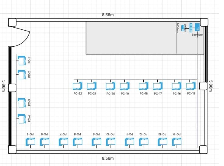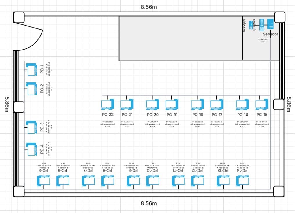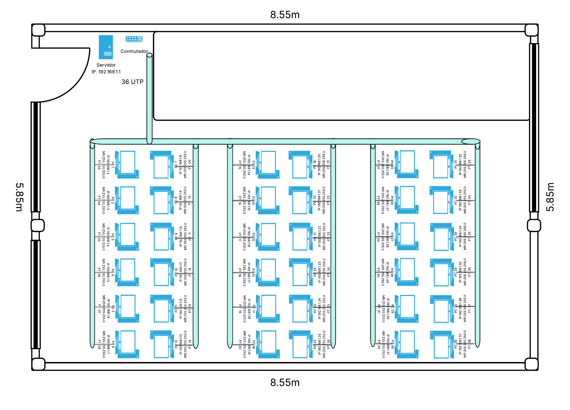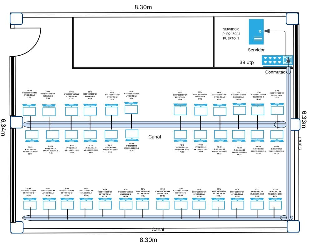 El mapa lógico complementa esta representación mostrando cómo se conectan los equipos dentro de la red. Incluye el servidor con su dirección IP, la numeración de cada equipo, el agrupamiento de las estaciones por filas y la forma en que todas ellas se comunican a través del switch. Gracias a este diagrama es posible entender la estructura interna, la topología aplicada y la manera en que se distribuye el tráfico de datos.