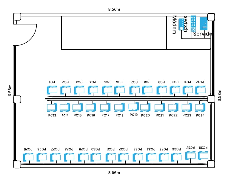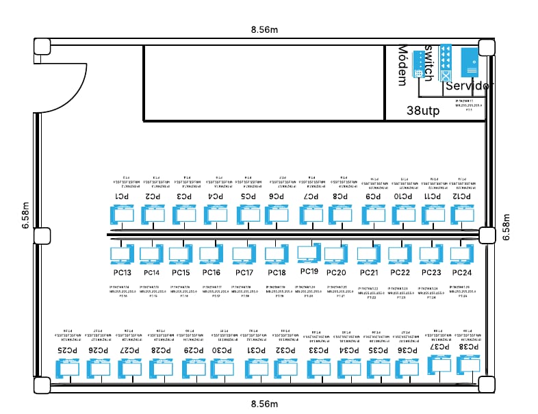 El mapa físico muestra la distribución real del aula, incluyendo la posición de las computadoras, las canaletas de cableado, las filas de mesas y el área donde se encuentra el servidor, el switch y el rack principal. También se indica la cantidad total de cables UTP —38 en este caso— y el recorrido que sigue el cableado desde cada equipo hasta el punto de concentración. Esta vista permite planificar el montaje, calcular las longitudes necesarias y garantizar que la instalación sea ordenada y segura.